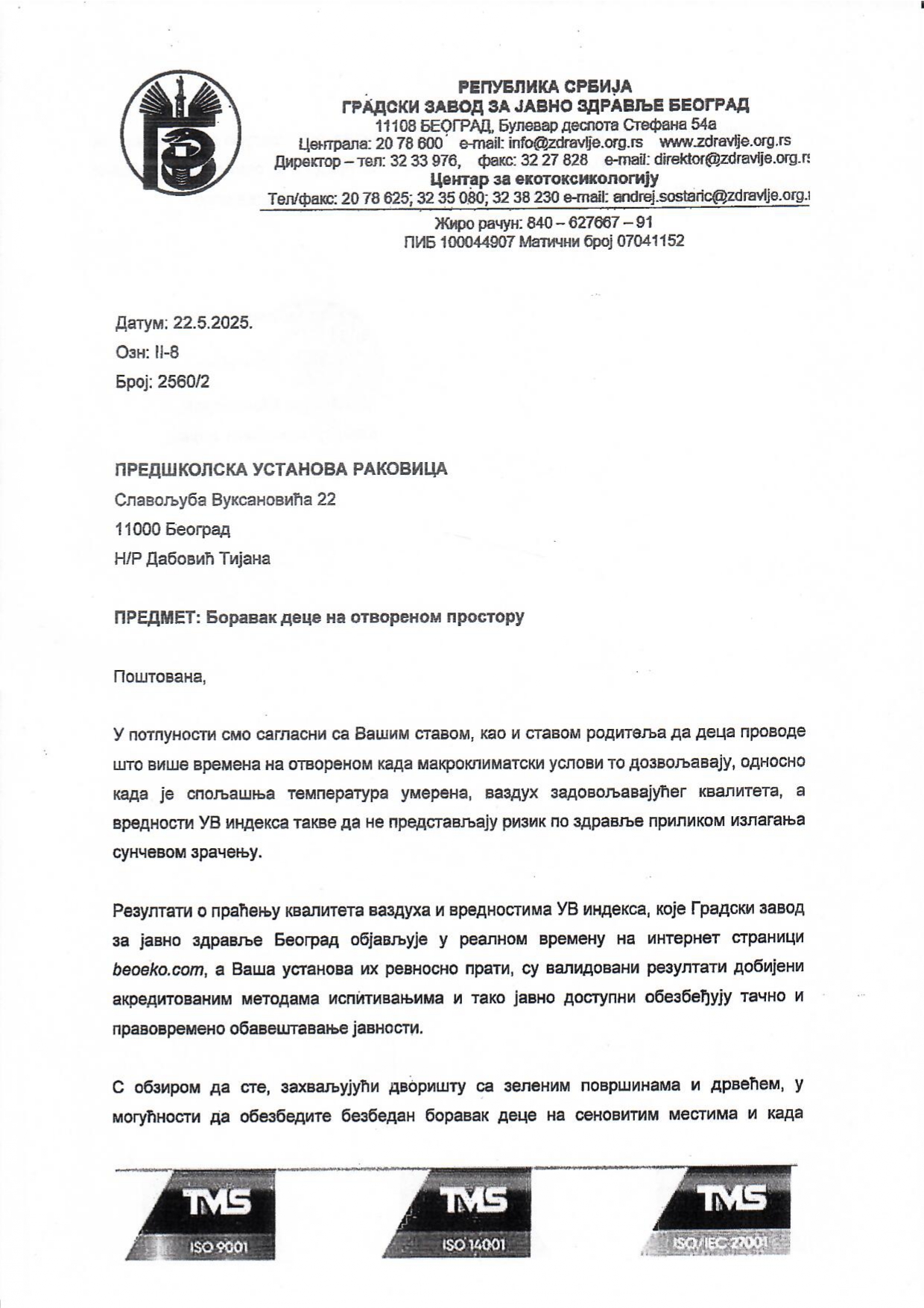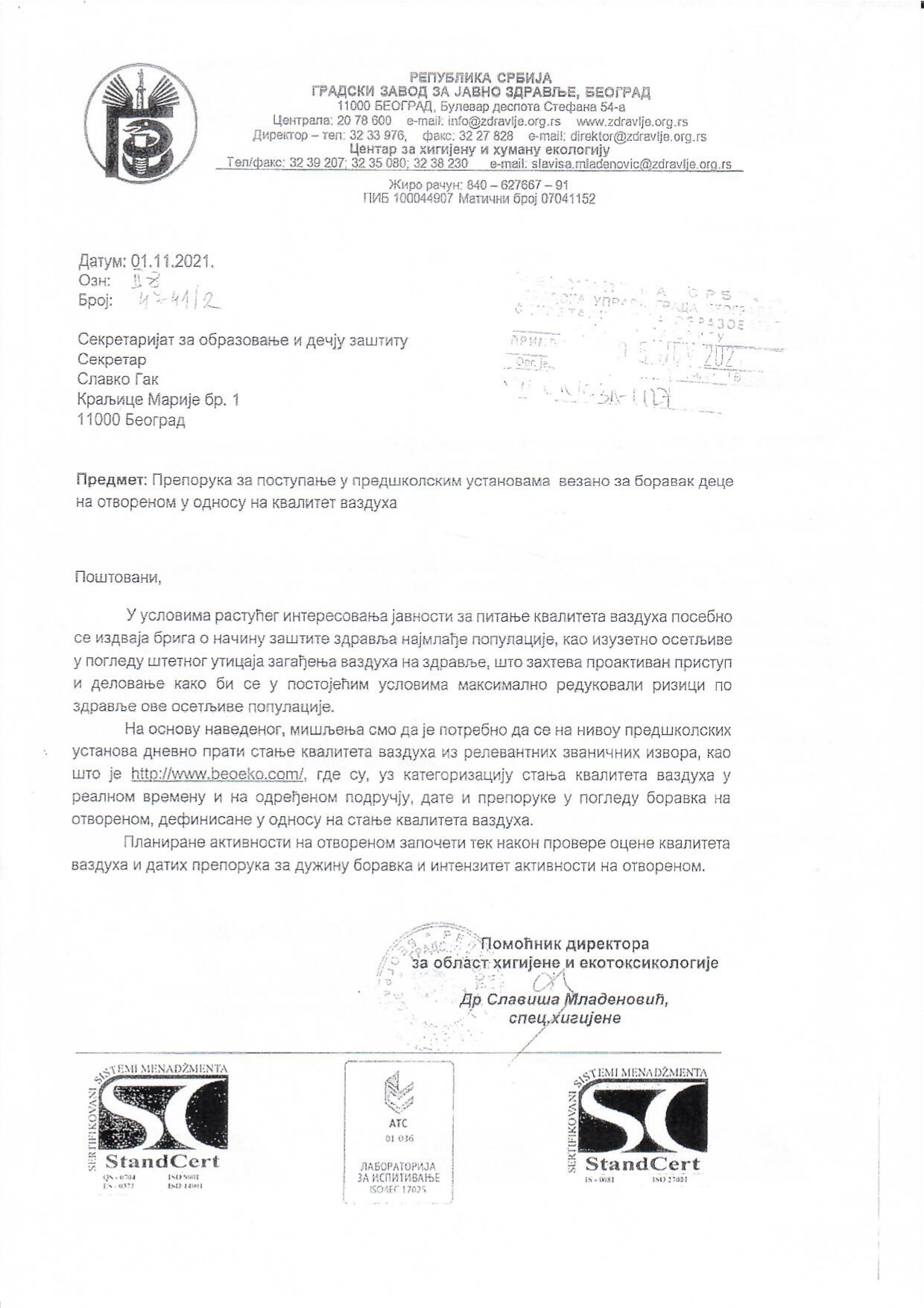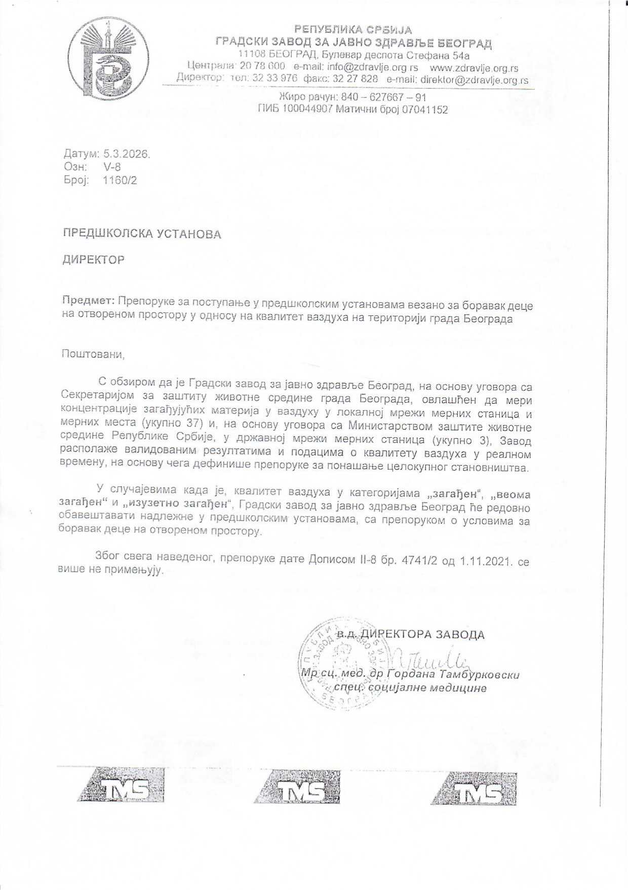 Препоруке за поступање у ПУ поводом боравка деце на отвореном простору у односу на квалитет ваздуха